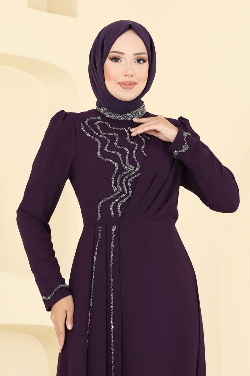 Taş Detaylı Şifon Abiye 8019AB368-MS Mor