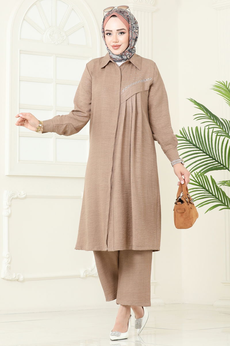 Ürün Detayları: Ürün modern tesettür modası kapsamındadır. Gömlek tipi yaka kullanılmıştır. Gizli düğmeli kapanışa sahiptir. Astarı yoktur. Taş detayları yapıştırma şeklindedir. Pantolonun beli elastiktir. Kol düğmeleri fonksiyoneldir.Ürünün renk tonlarında fotoğraf çekimlerine bağlı ufak değişiklikler olabilir.
