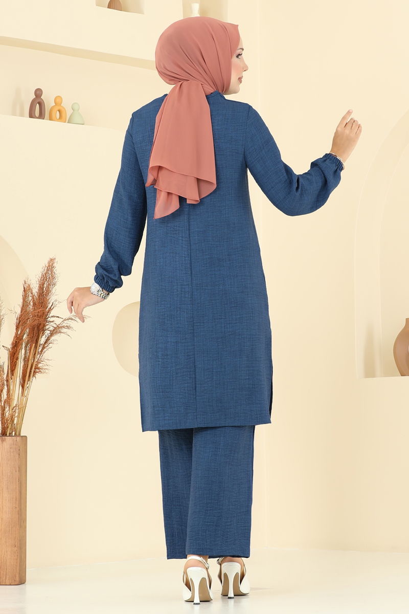 Ürün Açıklaması: Tesettür moda ürünüdür. Arkadan düğmeli. Bisiklet yaka. Yanlarda yırtmaç. Astarı yoktur. Taş detaylar yapışkan. Pantolon beli ve paçaları lastikli.Fotoğraf çekimleri nedeniyle renk tonlarında farklılık olabilir.