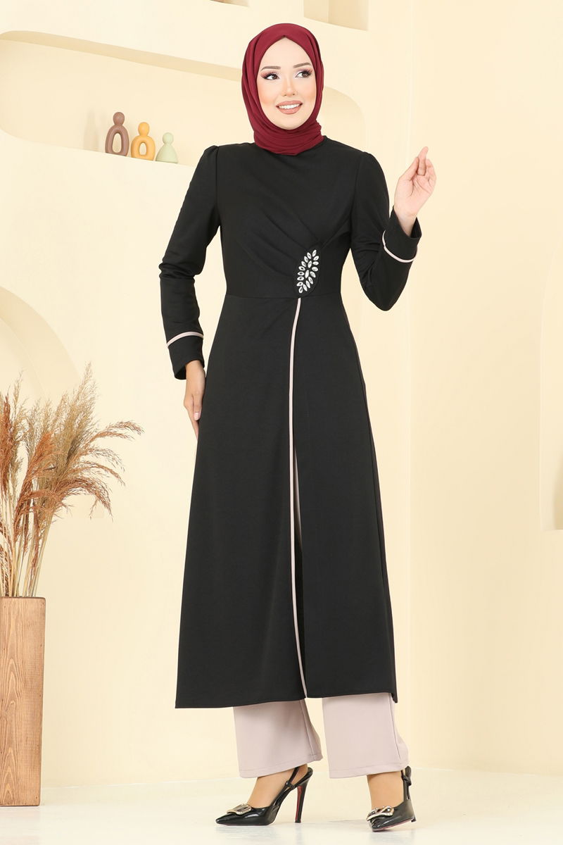 Taş Detaylı Yırtmaçlı Takım ASM2816-MS Siyah&Vizyon
