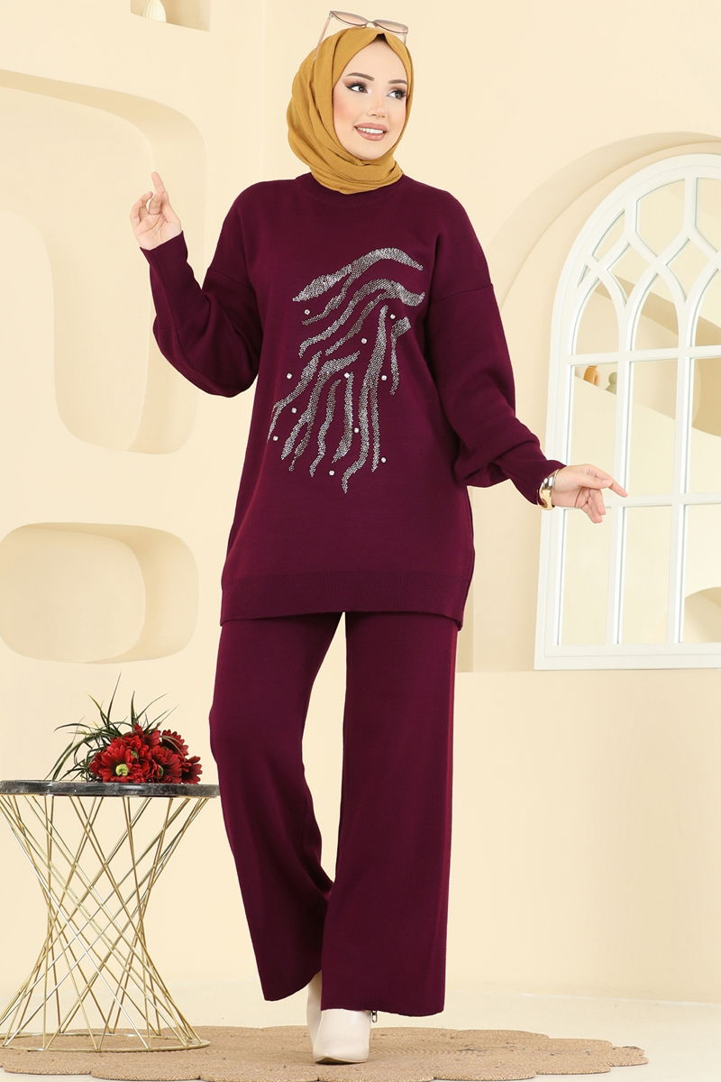 Taş İşlemeli Triko Takım 1106MT581-MS Bordo