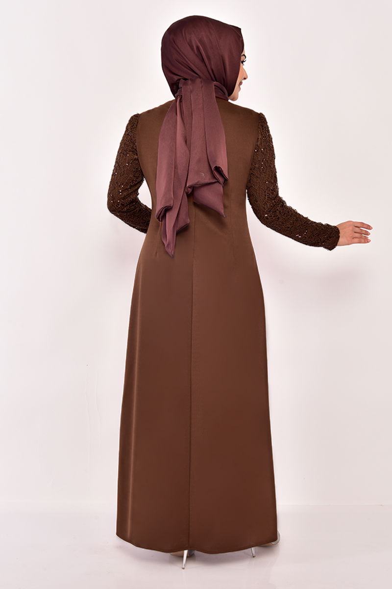 Ürün Özelliği         : Ürün abiye ürün olduğundan dört mevsim kullanılabilir. Arka kısmından gizli fermuarlıdır. Ön kısmında boydan taş detay bulunmaktadır. Etek kısmında ve kollarında pullu file dantel kumaş kullanılmıştır. Yarım likralı olduğundan kullanımı son derece rahattır.