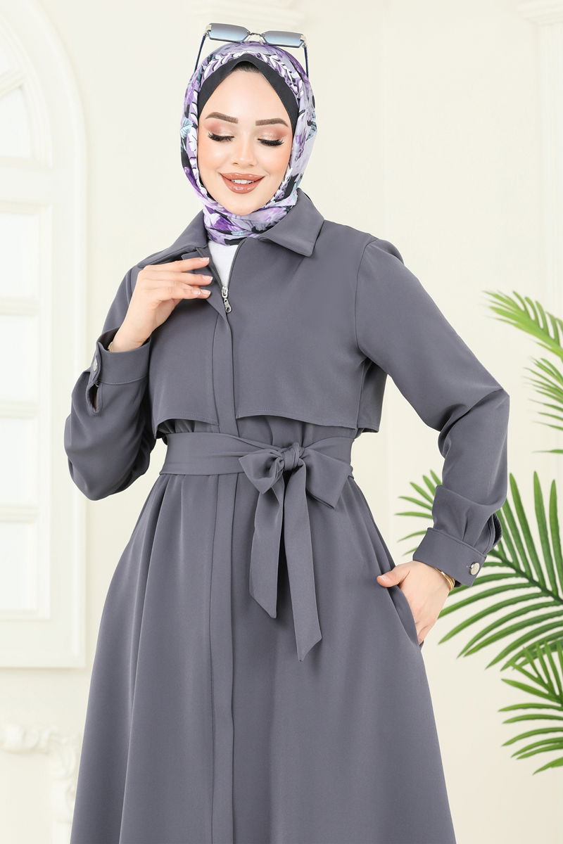 The Hidden Zipper Abaya is a stylish Islamic clothing item that can be worn comfortably across all seasons. Made from delicate woven Dabıl fabric, this model features a shirt collar design and is unlined. It stands out with its convenient front zipper. The belt at the waist is sewn at the ends to prevent waviness and can be removed if desired. Additionally, the cuffs come with active buttons for ease of use, and the broad pockets offer extra comfort. The product can be cleaned with a gentle wash at 30 degrees.