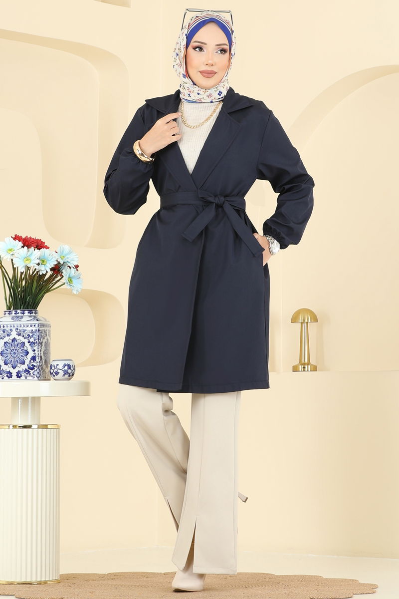 Product Feature : It is a new season hijab fashion product. The product has a Double-breasted collar. Unlined. There is no belt bridge on the product. Belt included, optional not available. The product has a pocket. The cuff is rubberized. There may be a tonal difference in the product due to concept photo shoots.
