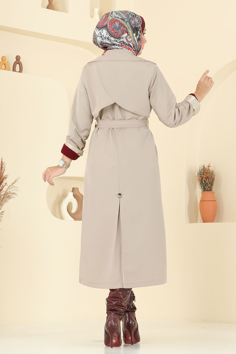 Designed specifically for the autumn and winter seasons, the Belted Trench Coat is suitable for modest fashion. Made from the delicate soff fabric, this trench coat stands out with its double-breasted collar and button-front design. The product can be washed at 30 degrees on a gentle cycle. The vent is not active and it is lined, offering ultimate comfort and elegance. The product displayed on the model is a size 38, and it is available in a variety of sizes to cater to different needs. With every detail polished, this trench coat is set to become an indispensable part of your winter wardrobe with its stylish design and practical features.