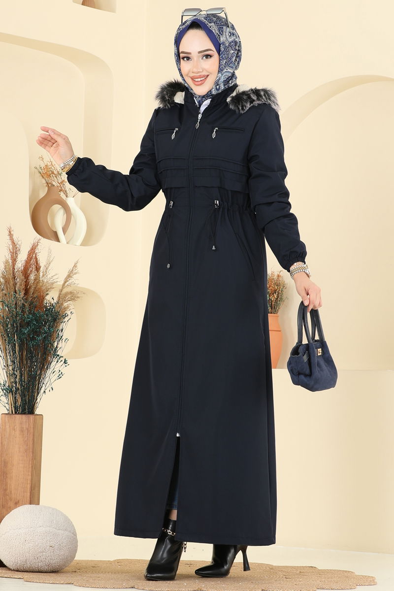 Product Feature : It is a new season hijab fashion product. The hood is detachable and can be used optionally. It has a laced waist. The product has a Upright collar. The lining is made of fur.. The product has a zipper at the From the front part. The fur is sewn into the product. Zipper detail is an accessory. The product has a pocket. The cuff is rubberized. There may be a tonal difference in the product due to concept photo shoots.