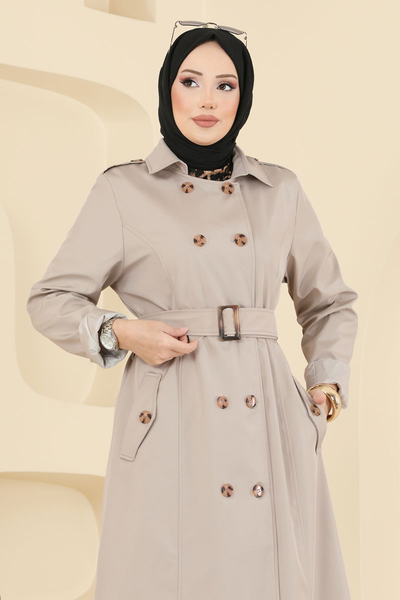 The Front Buttoned Bondit Trench Coat is an ideal choice for the autumn and winter seasons, suitable for modest fashion. Made from delicate Bondit fabric, this trench coat offers practical usage with its machine washable at 30 degrees feature. It has a shirt collar and front buttons that provide an elegant appearance and is lined for comfortable wear. The included belt, designed to prevent waviness, can be optionally removed. It also features convenient pockets. The product displayed is in size 42.