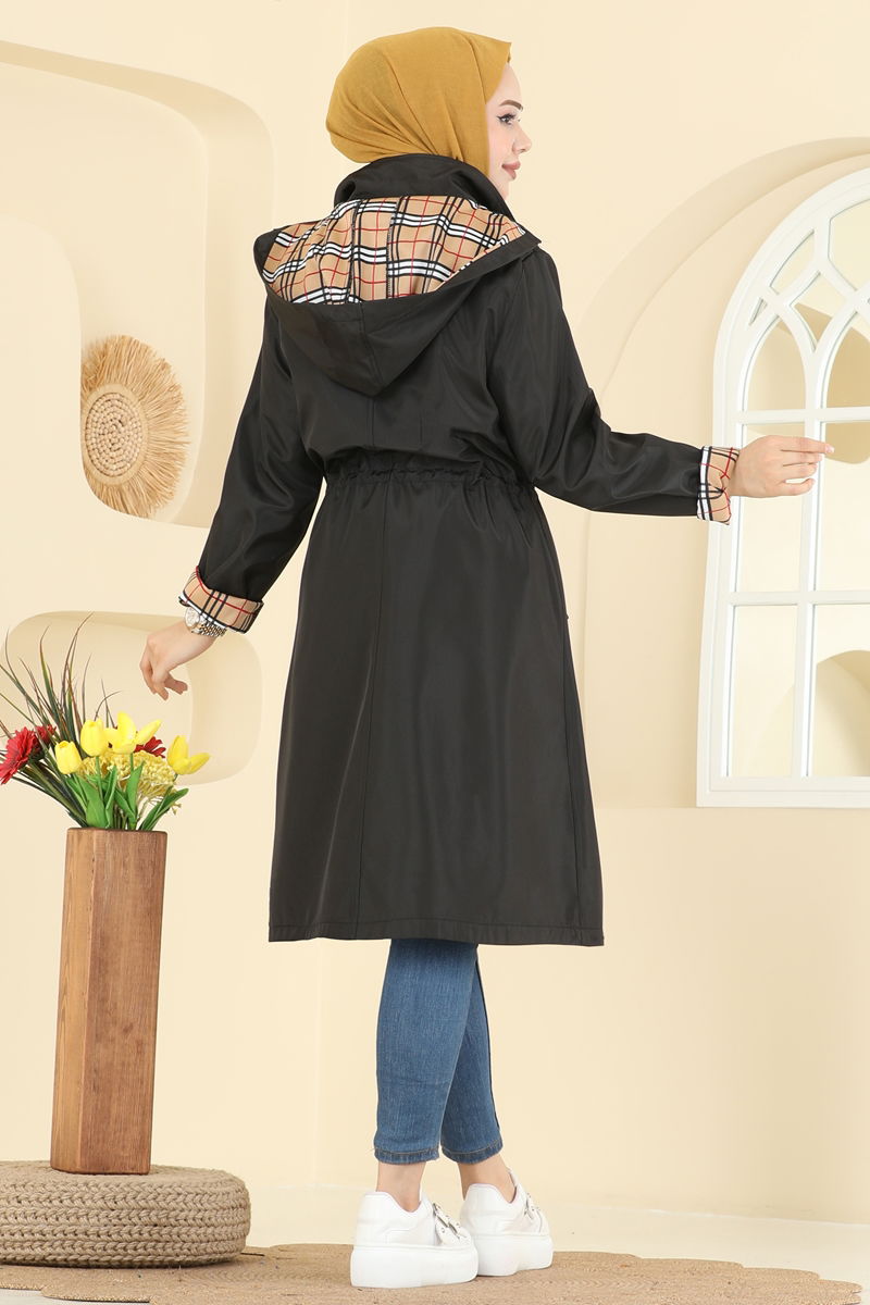 The Hooded Detail Bondit Trench Coat is a modest wear design, perfect for autumn and winter. It can be washed delicately at 30 degrees and is made from quality bondit fabric. Featuring a semi-high collar, unlined design, and a front zipper, it offers practical use. Adjustable waist drawstrings and a pocket detail enhance usability, while the fixed hood and snap closure make it easy to wear.