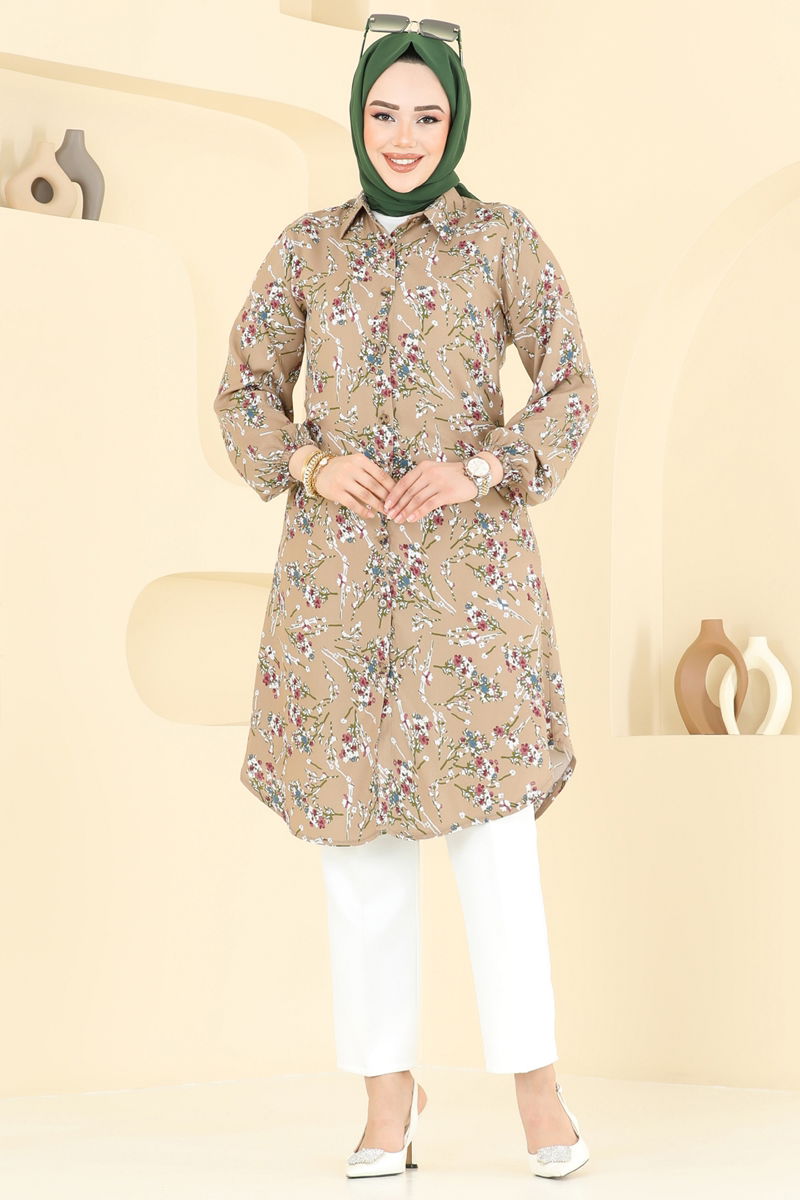Floral Pattern Viscose Tunic is a modest wear piece perfect for all seasons. Made from soft viscose fabric, it features a shirt collar design and front button details for both style and convenience. Recommended for hand wash, this unlined tunic offers a lightweight and comfortable fit. Elasticated cuffs ensure an easy dressing experience. The product shown on the model is size 38.