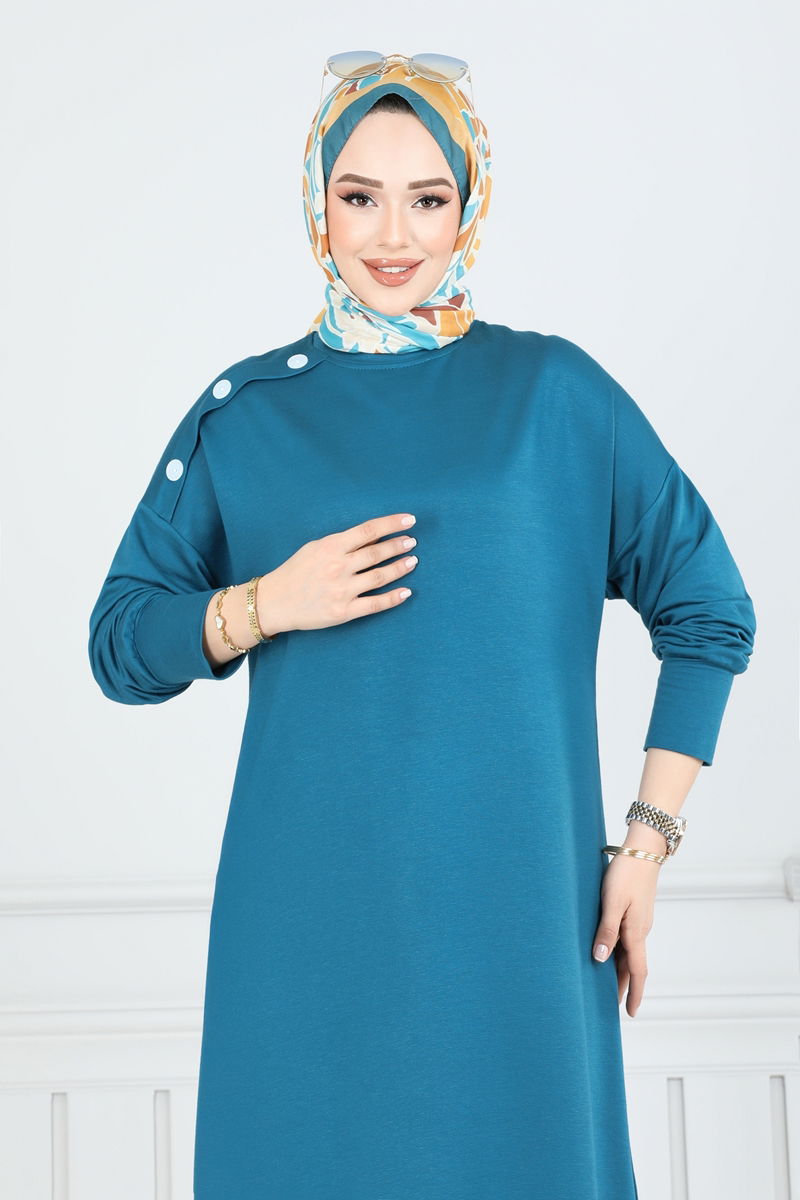 The Accessory Buttoned Hijab Tunic is a modest wear suitable for all seasons. It features a delicate wash at 30 degrees, making it easy to maintain. Crafted from Crystal Two Strand fabrics, our tunic has a crew neck and side slit details. Its unlined design provides a light and comfortable fit. The dimensions are 165 cm length, 88 cm chest, 68 cm waist, 99 cm hips, and it weighs 56 kg. It's designed to prioritize both your style and comfort.