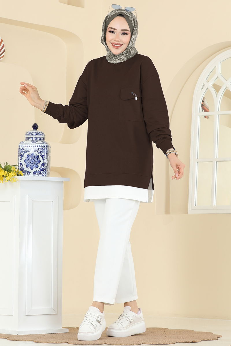 The Two-Thread Pocket Detailed Tunic combines comfort and elegance seamlessly. Ideal for women who prefer modest clothing, this tunic can be comfortably worn across all seasons. Made from dual-thread fabric, it stands out with its durability and can be washed at 30 degrees due to its sensitive material. The scooter neck design and slits on the sides offer a contemporary look, while the optional brooch adds a touch of elegance. The breast pockets are functional, and the cuffs are elasticized. Its overhead wearing feature makes this tunic a practical choice.