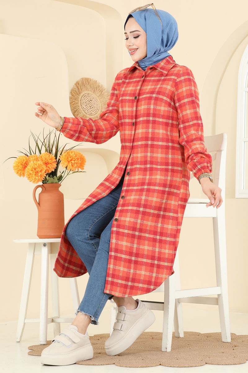 The Square Patterned Checkered Tunic is a stylish and modern modest wear designed for the autumn and winter seasons. Made from delicate checkered fabric, this tunic can be washed at 30 degrees on a gentle cycle. Featuring a shirt collar and front button design, it offers practical use. The lack of lining and the elastic detail at the cuffs enhance comfort. The product shown on the model is size 38, providing an ideal fit.