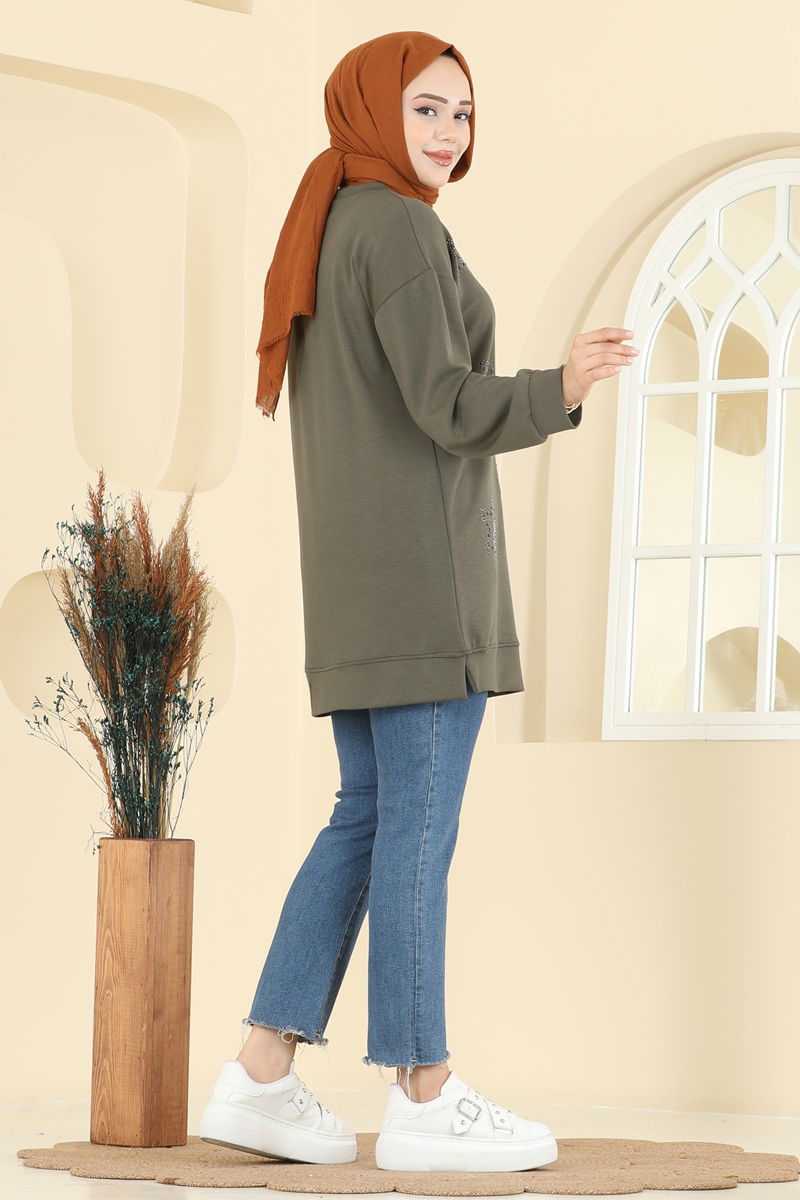 The Star Detailed Modal Tunic offers elegant design and can be comfortably worn in all seasons. Made from high-quality modal fabric, this tunic can be washed at 30 degrees with delicate care. It features a crew neck and a lining-free design for comfort, and its eye-catching stick-on gem details add a touch of sophistication. Available in size Small, this model provides a modern and stylish option for modest wear.