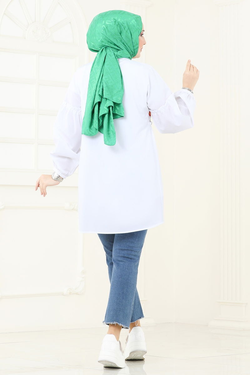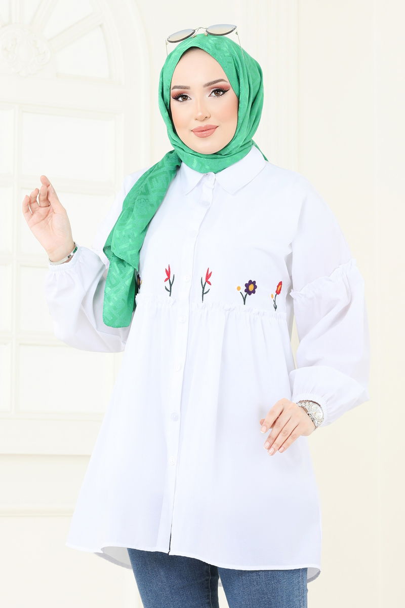 Embroidered Tunic is a stylish modest wear product that can be comfortably used in all seasons. Made from poplin fabric, this tunic offers practical wear with its shirt collar design and button-down front. It can be washed at 30 degrees with delicate care. Its unlined structure and elasticized cuffs enhance comfort. Embellished with embroidery details, this tunic helps you achieve a sophisticated look. (Model wears size 38; Height: 165 cm, Chest: 88 cm, Waist: 68 cm, Hip: 99 cm, Weight: 56 kg.)