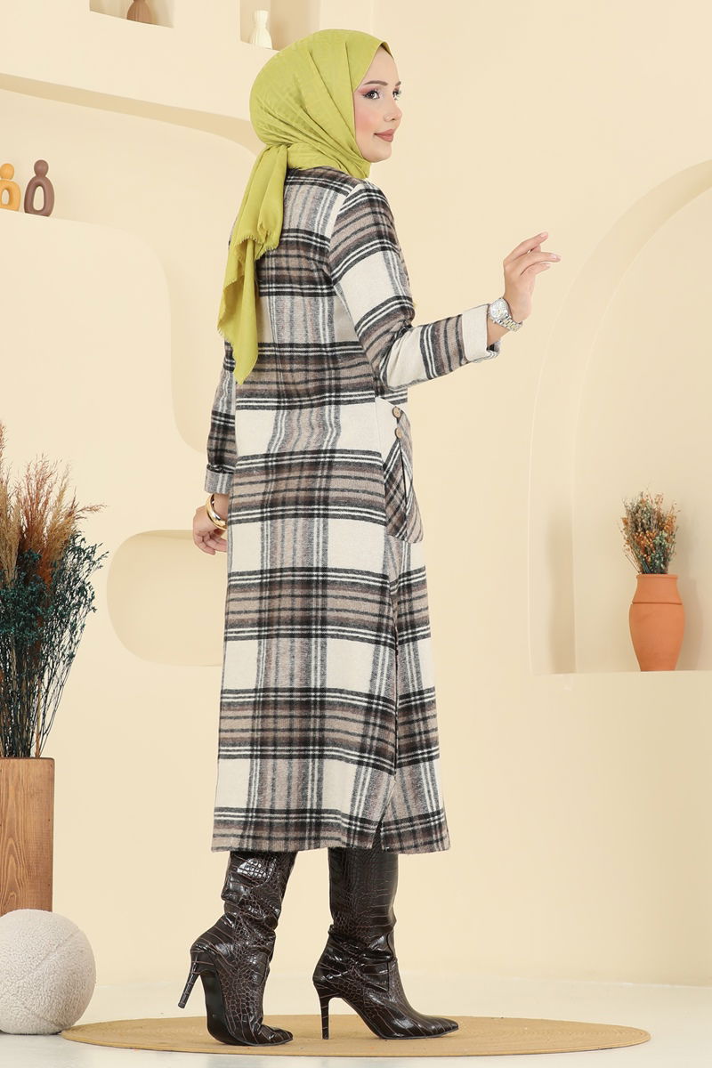 Accessories Buttoned Plaid Tunic is a modest fashion model suitable for Autumn and Winter seasons. It should be washed at 30 degrees without squeezing. It is made of first-class Plaid fabric. The product has a bicycle collar and buttoned from the back. It has no lining. (The product on the model is size 38.) The buttons are for decoration. There is a pocket.