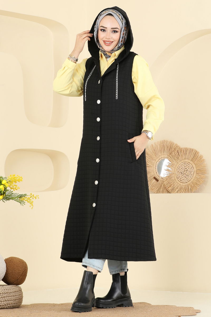 Stay warm and stylish during the autumn and winter months with the Quilted Vest with Accessory Chain! Made from delicate quilted fabric, this vest offers gentle washing at 30 degrees. Its eye-catching hooded and chain accessory design is complemented by practical button details and a pocketed structure, ensuring functionality. This unlined model provides comfortable wear. The perfect fusion of classic and modern details, this vest will become an essential part of your winter wardrobe!