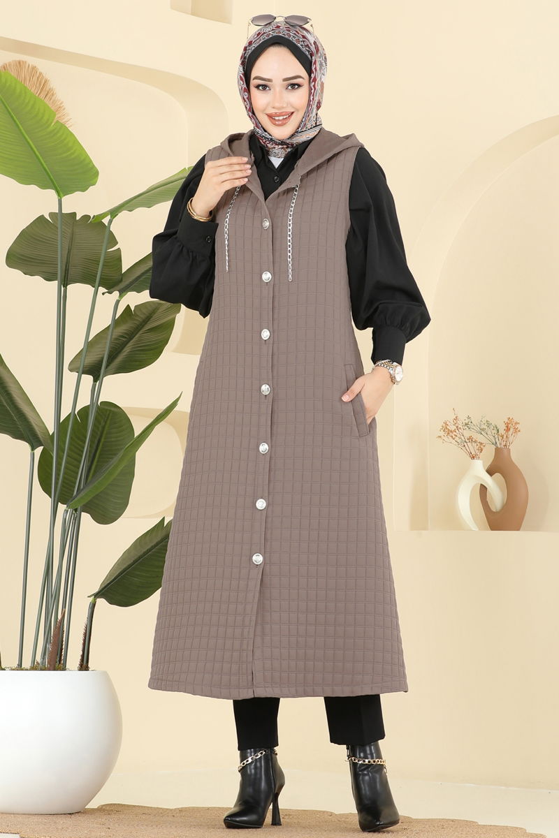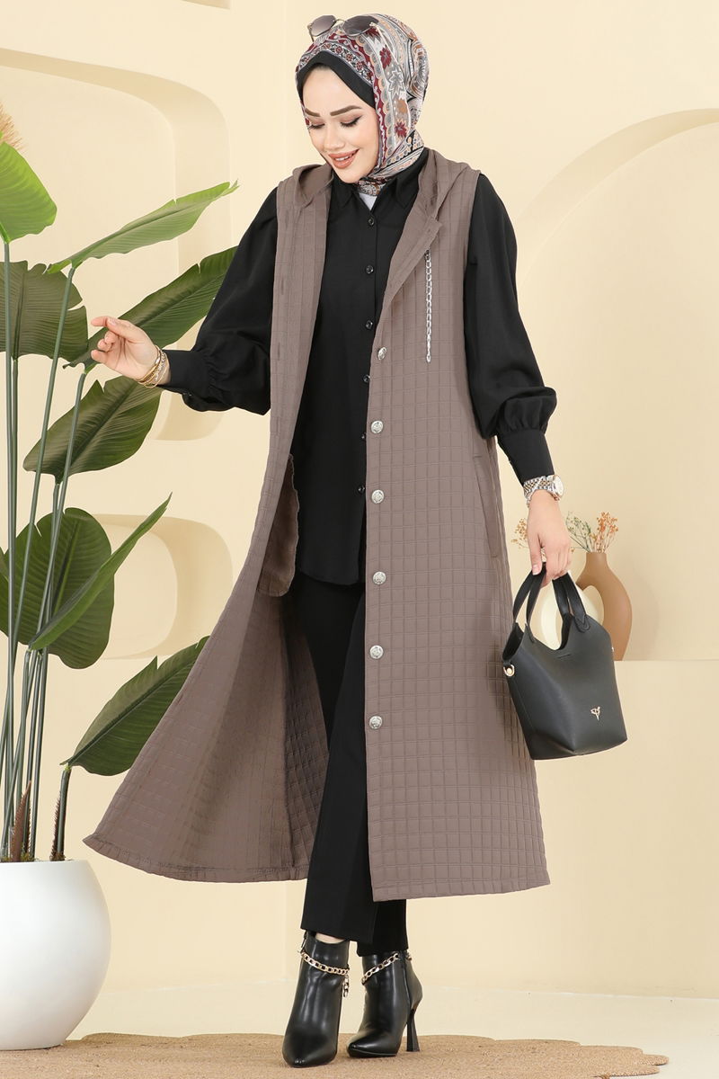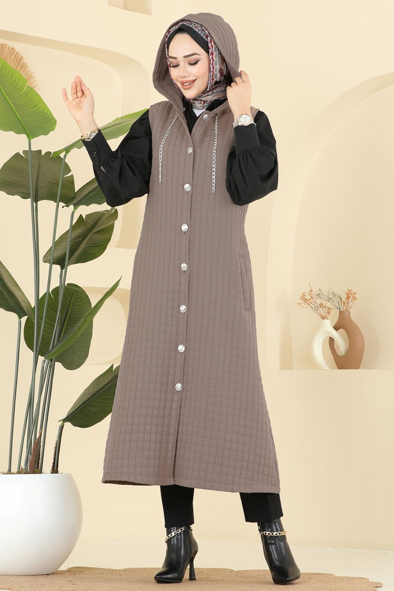 Product Feature : It is a new season hijab fashion product. The product has a Hooded collar. The product has From the front buttons. Unlined. The chain is sewn to the product. The hood is sewn to the product. Pocket available. There may be a tonal difference in the product due to concept photo shoots.