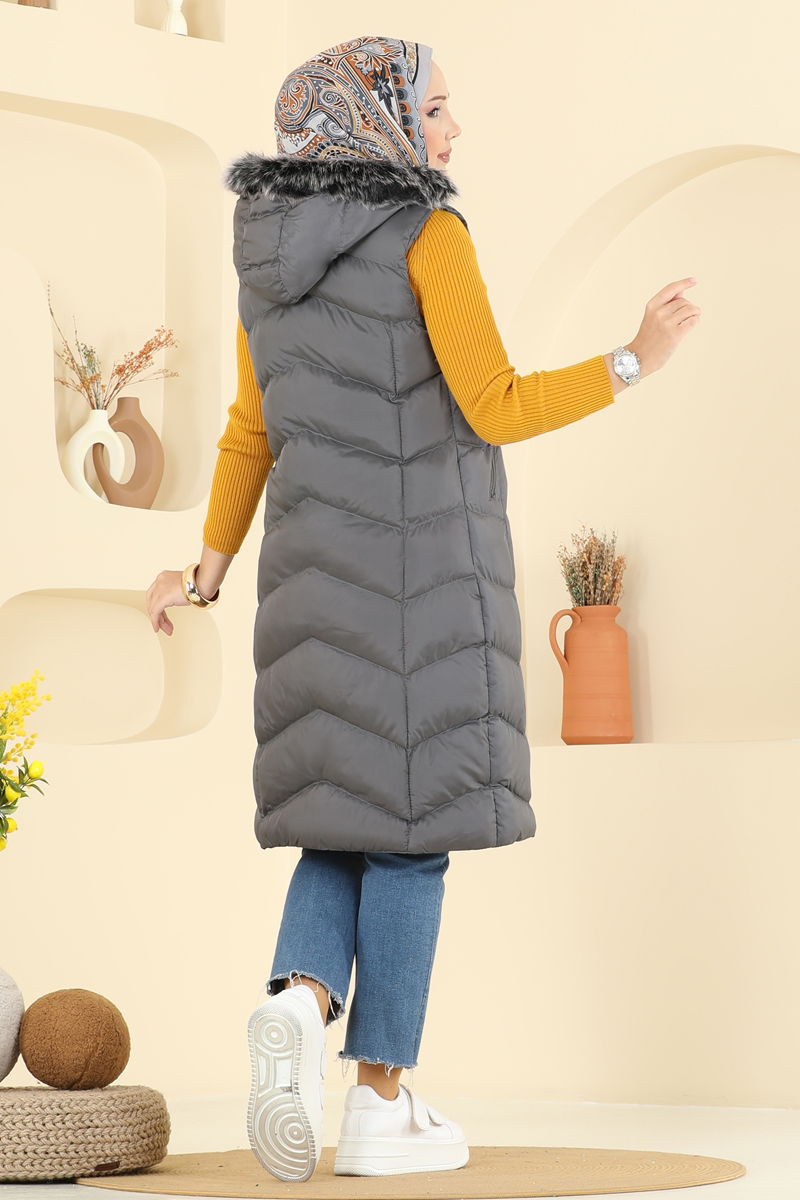 Hooded Fur Trimmed Hijab Vest model hijab product. Can be used in Autumn and Winter seasons. It should only be dry cleaned. It is made of first-class quilted fabric. The product has a Hooded collar. It is lined. The product is zippered from the front. Height: 160 cm, Chest: 86 cm, Waist: 68 cm, Hip: 95 cm, Weight: 52 kg. The fur is sewn to the product. The hood is included in the product, it may be used optionally. There is a pocket.
