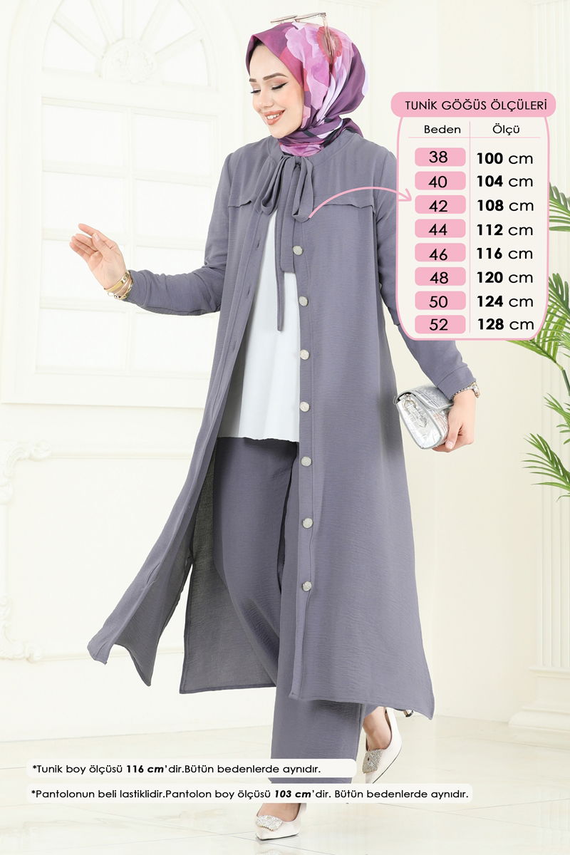 Ürün Özellikleri : Tesettür modası için tasarlanmış yeni sezon ürünüdür. Fular tipi yaka detayına sahiptir. Ön kısmı düğmeli kapamadır. Tunik yanlarda yırtmaç detaylarına sahiptir. Astarsız tasarımdır. Bağcıklar estetik bir ayrıntı olarak eklenmiştir. Bluz dahil değildir ve kombin önerisi olarak bluz kullanılmıştır. Pantolonun beli elastik yapıdadır.Ürün fotoğrafları farklı aydınlatma koşullarında çekildiği için renk tonlarında farklılık olabilir.