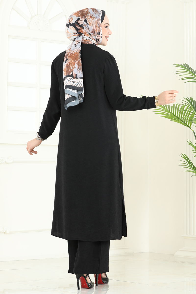 Her türlü ortama uyum sağlayan Kordon Detaylı Siyah Aerobin Kıyafet Seti, modern çizgilere sahip tesettür giyim tercihlerinizde idealdir. Dört mevsim boyunca rahatlıkla kullanılabilir. Aerobin kumaşındaki bu set 30 derecede hassas yıkamaya uygundur. Düğme detayları ile ön planda olan tunik, yan yırtmaçlarla hareket özgürlüğü sağlar. Kordonlu yaka detayı ile şık bir görünüm sunan set, günlük kullanım için idealdir. Lastikli beli sayesinde pantolon konforlu bir kullanım olanağı tanır.TUNİK BEDEN TABLOSU (CM)Beden Göğüs Uzunluk 38 100 116 40 104 116 42 108 116 44 112 116 46 116 116 48 120 116 50 124 116 52 128 116 PANTOLON BEDEN TABLOSU (CM)Beden Uzunluk 38 103 40 103 42 103 44 103 46 103 48 103 50 103 52 103 Ağırlık(Kg):0.59 -