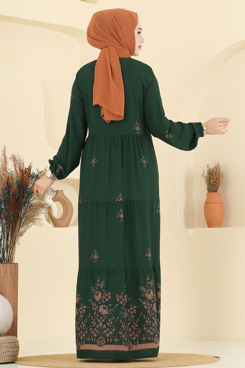 Yakası Bağcıklı Desenli Elbise 5012ERK1158-MS Zümrüt