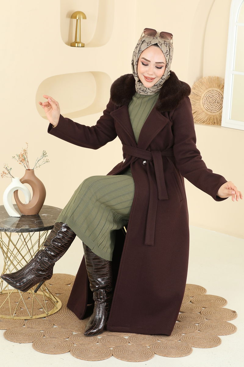 Yakası Kürklü Kaşe Kaban 6664YG95-MS Acı Kahve