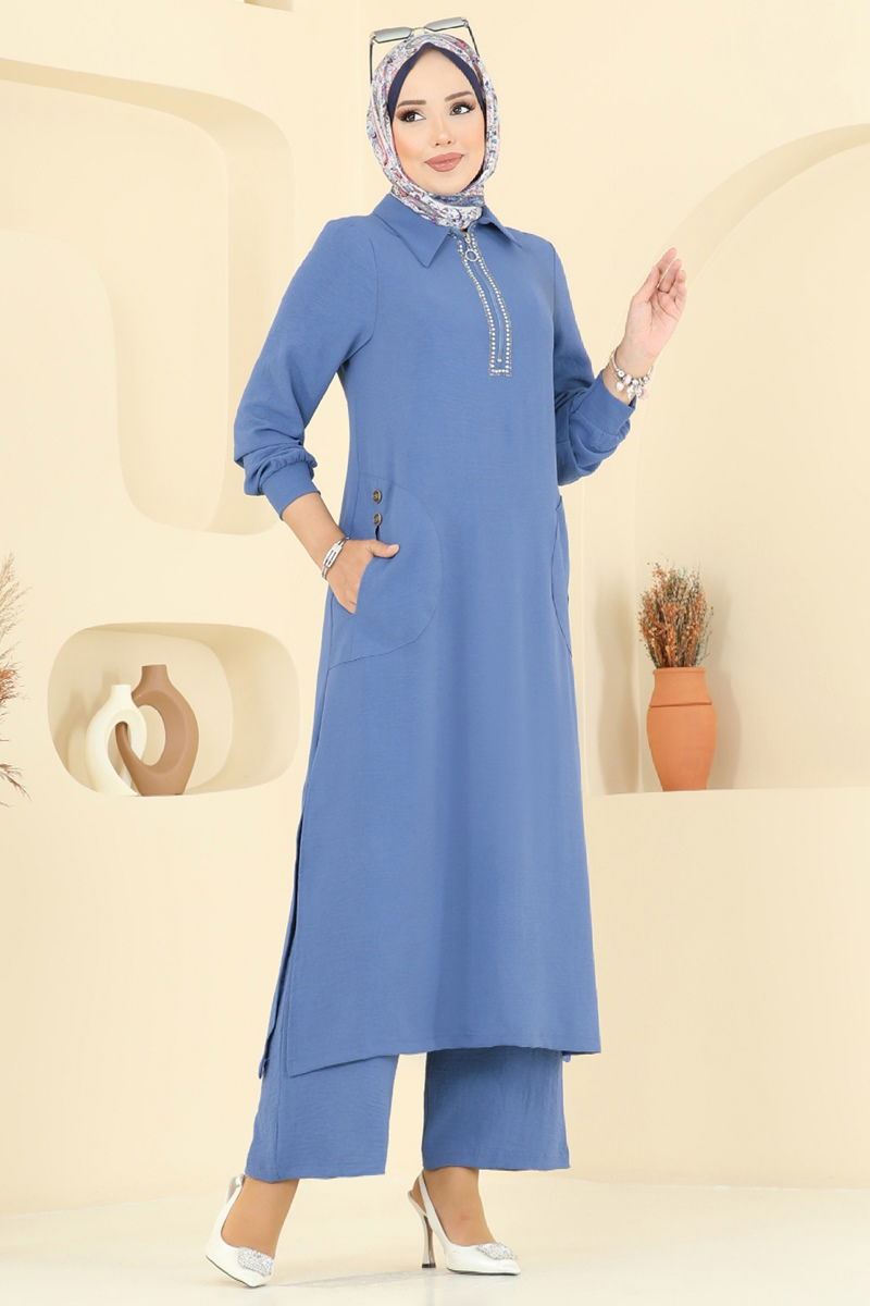 Yakası Taş Detaylı Tunik Takım 446DVL817-MS İndigo