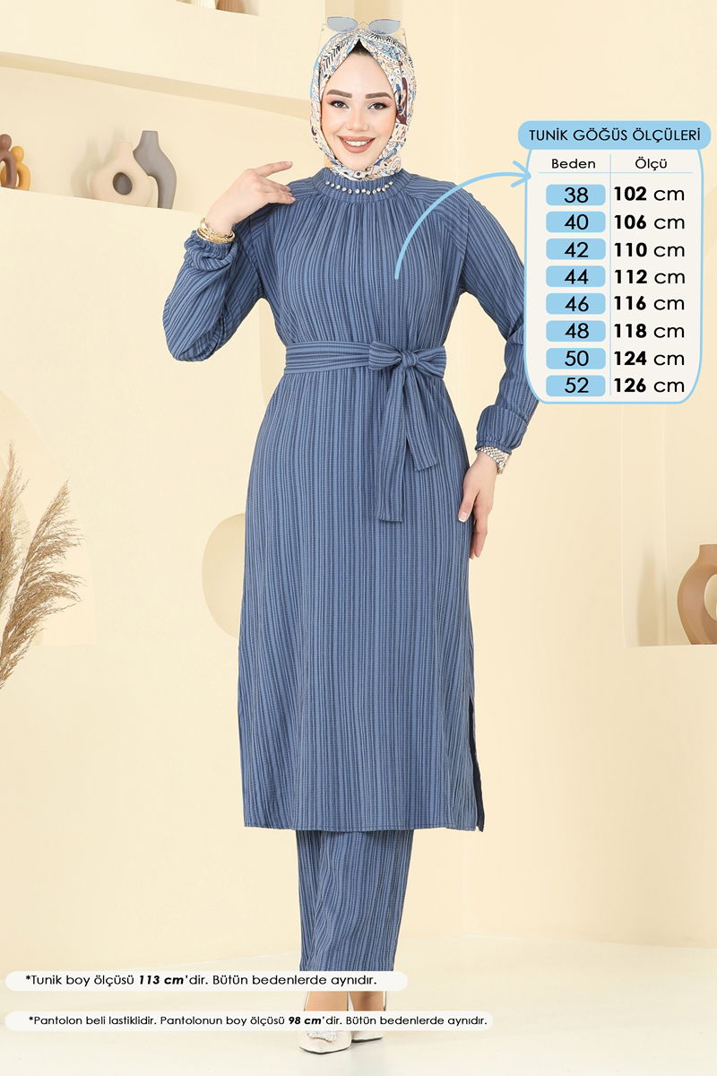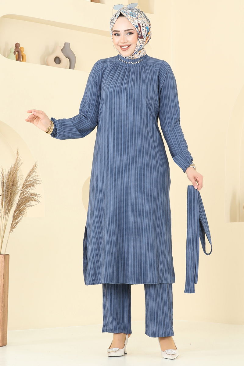 Yakası Taşlı Tesettür Takım 4085PM271-MS İndigo