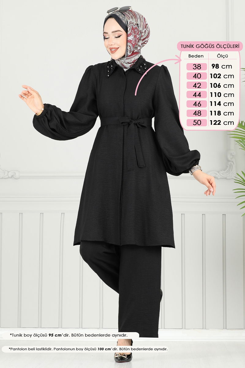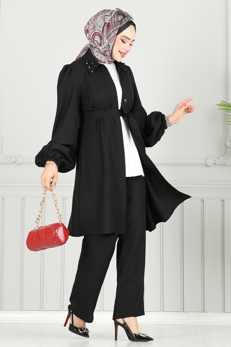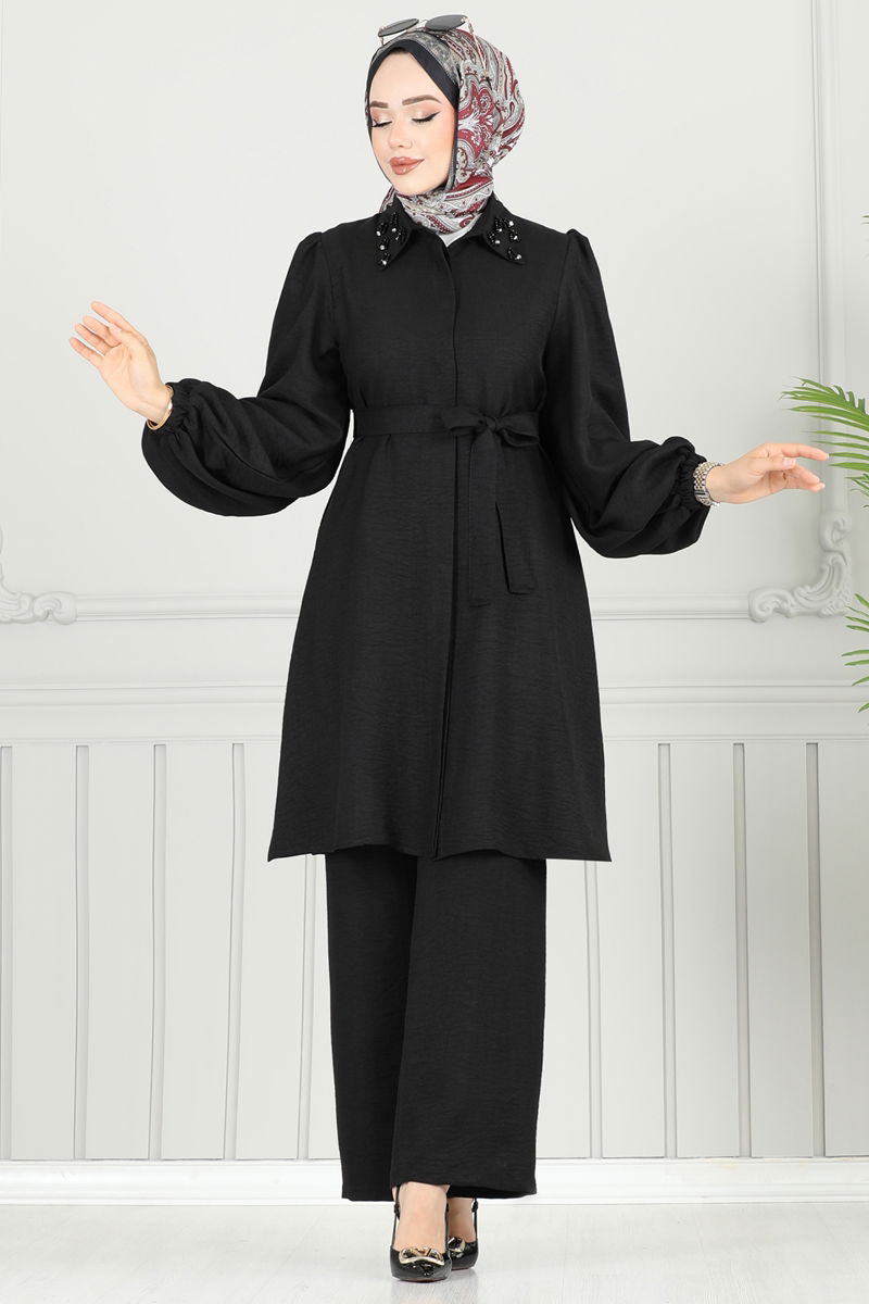 Yakası Taşlı Tesettür Takım 9038S324-MS Siyah
