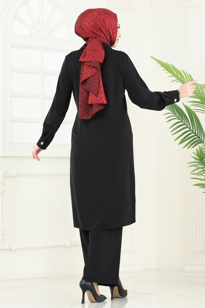 Ürün Özellikleri: Tesettür moda ürünüdür. Gömlek tipi yakaya sahiptir. Önden düğmeli. Tunikte yan yırtmaç mevcuttur. Astarsızdır. Kemer takımın bir parçası olarak sabitlenmiştir. Taş detayları yapıştırılarak eklenmiştir. Bluz takıma dahil değildir, bluz sadece kombin örneği olarak kullanılmıştır. Cep detayları süs amaçlıdır. Pantolonun bel kısmı lastiklidir. Manşet düğmeleri fonksiyonel. Fotoğraf çekimi tekniklerinden dolayı üründe renk farklılıkları olabilir.