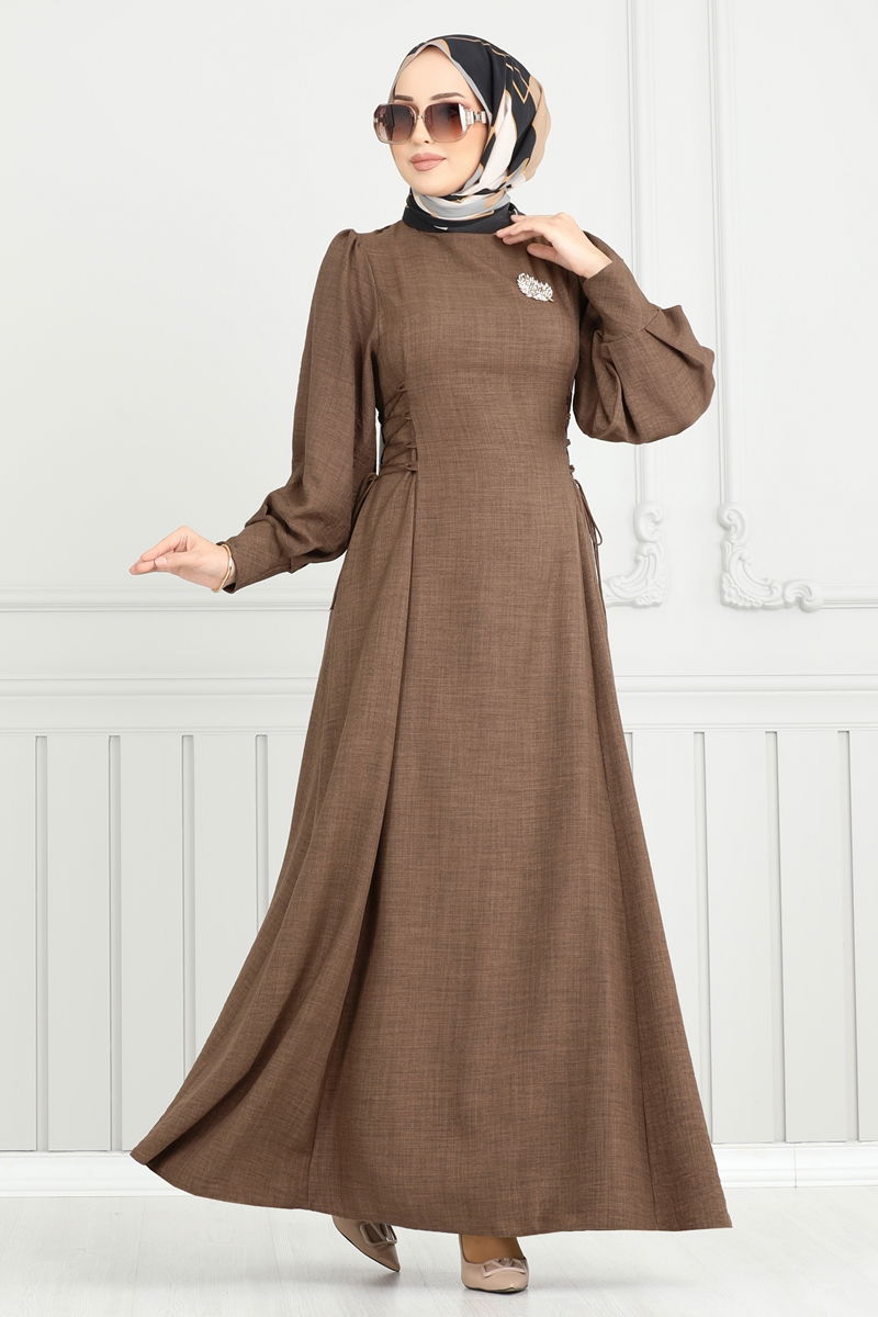 Yandan Bağcıklı Tesettür Elbise 5962BSK463-MS Açık Kahve