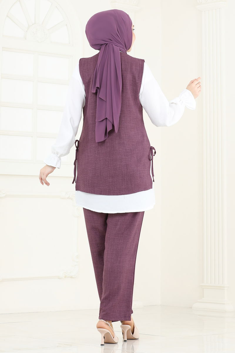 Koyu Gül Kurusu Renkli Yan Bağlamalı Üç Parçalı Takım