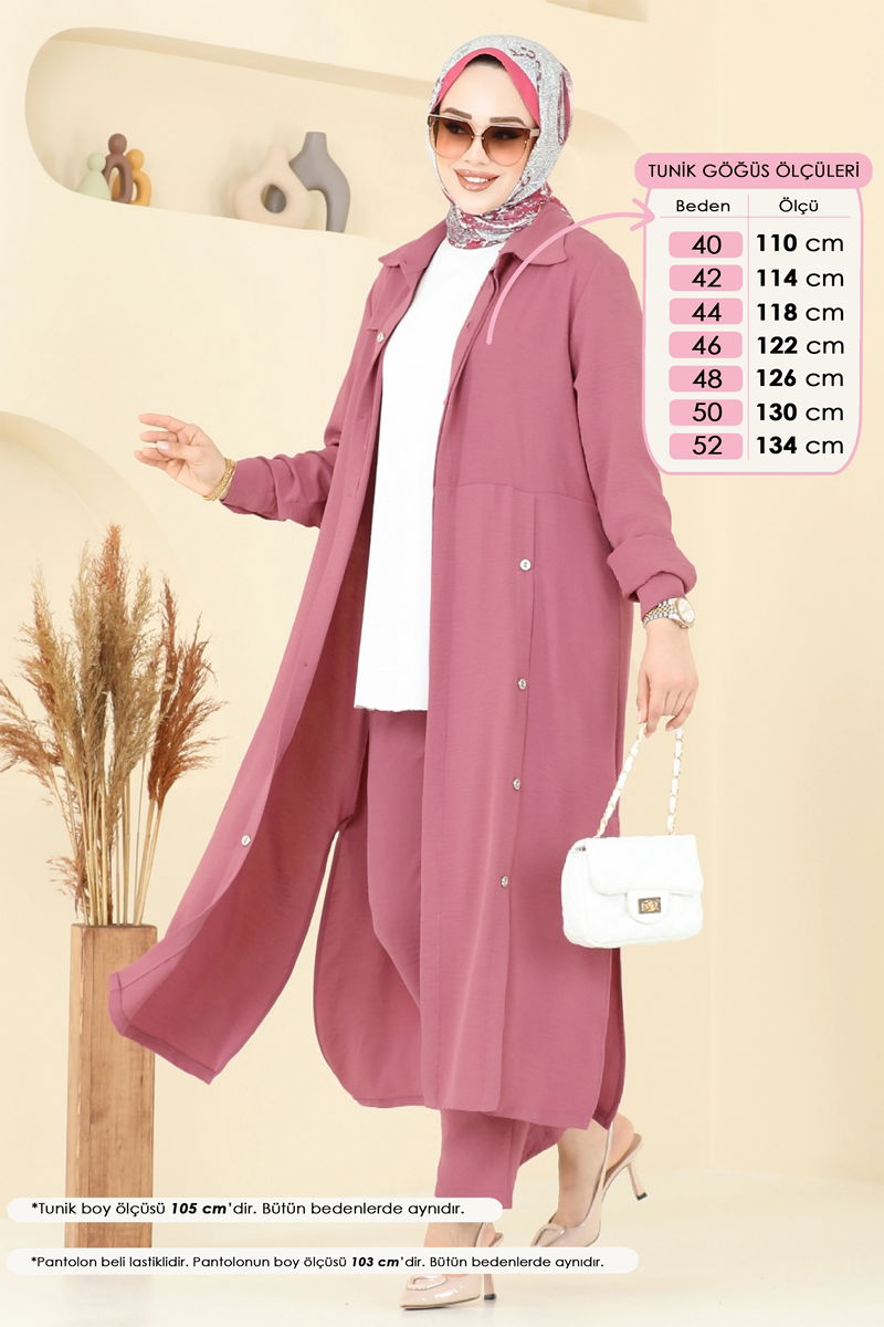 Ürün Özellikleri: Moda dünyasına uygun yeni sezon tesettür tasarım ürünüdür. Gömlek yaka şeklinde tasarlanmıştır. Ürün üzerinde gizli düğmeler bulunmaktadır. Yan yırtmaç düğmeleri görsel bir aksesuar görevi görür. Astarsız bir yapıya sahiptir. Düğme ayrıntıları dekoratif amaçlıdır. Fotograf çekimleri sırasında renk farklılıkları yaşanabilir. Bluz kombin önerisi olarak sunulmuş, sete dahil değildir. Yanlarda cepler mevcuttur. Pantolonun beli lastikli yapılardandır. Çalışan manşet düğmeleri vardır.