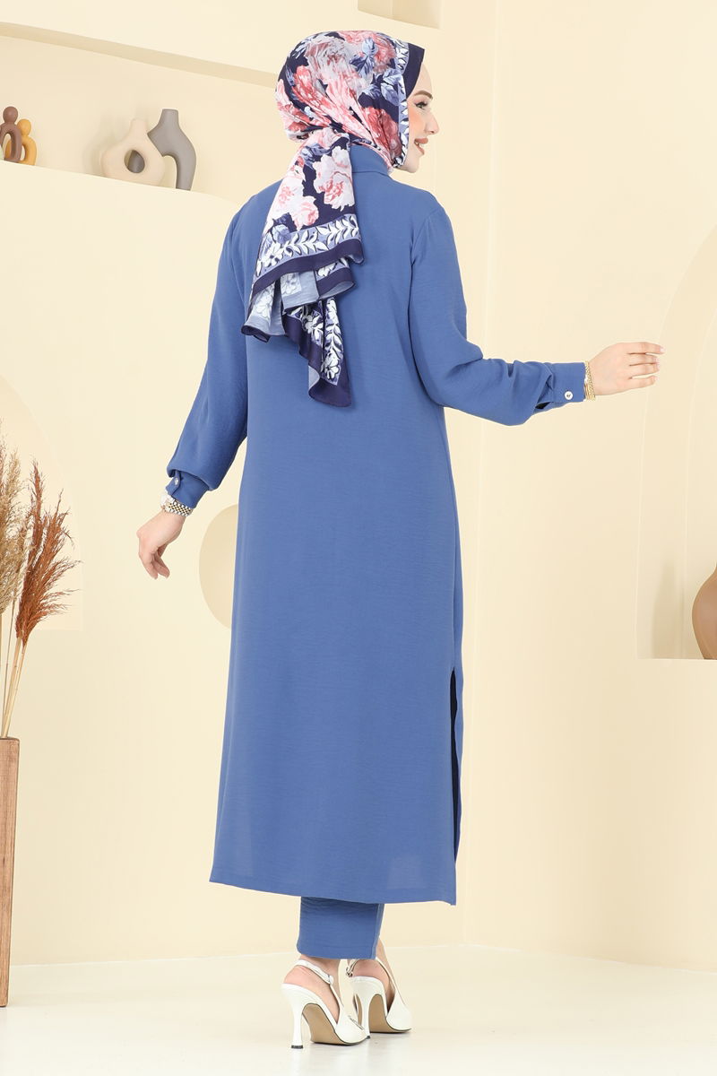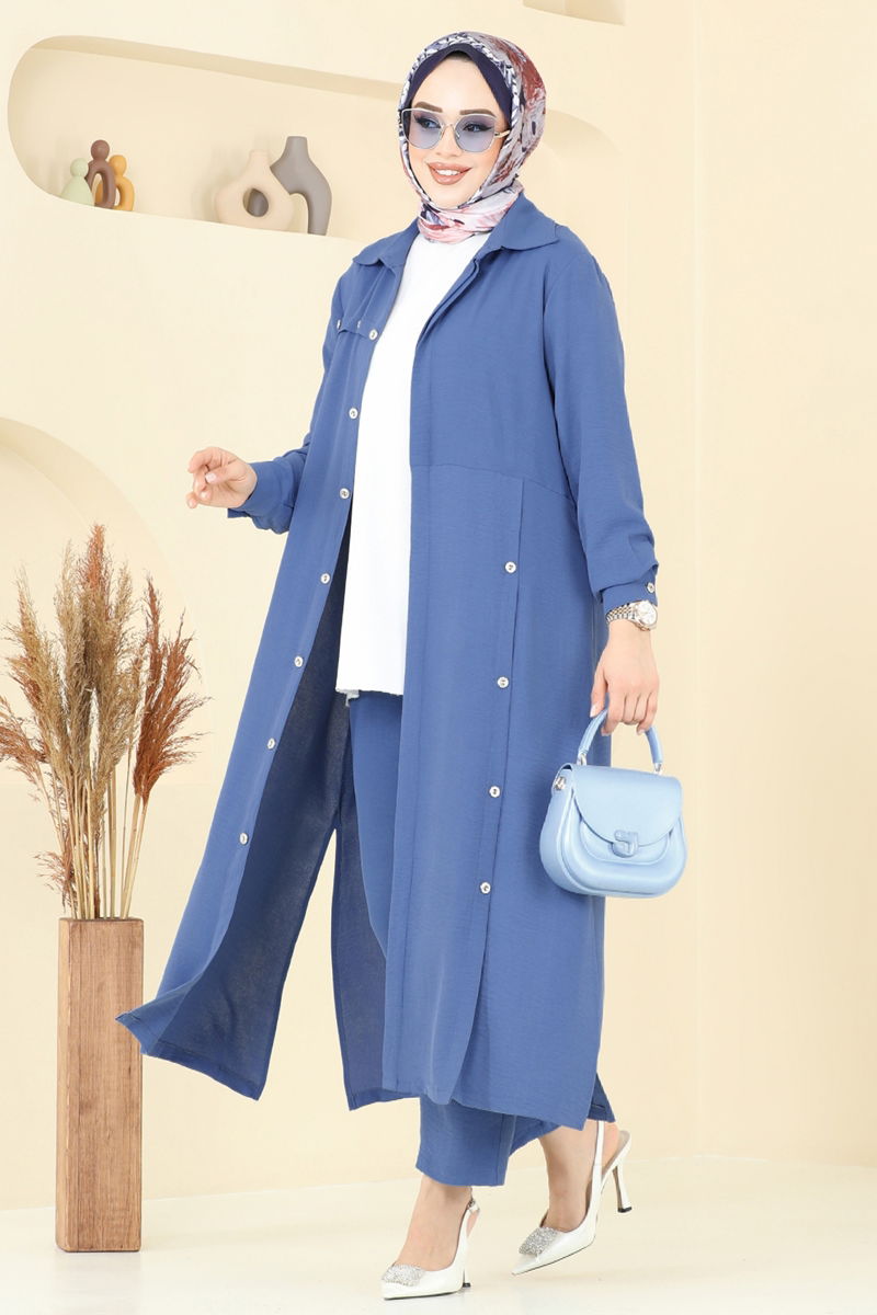İndigo Yırtmaçlı Aerobin Takım, tesettür giyimde şıklığı ve rahatlığı bir arada sunar. Aerobin kumaşın yılın her mevsimi kullanıma uygunluğu ve hassas yıkama imkanı pratiklik sağlar. Gizli düğme ve aksesuar niteliği taşıyan manşet düğmeleri stil sahibi bir görünüm kazandırır. Elastik bel pantolon rahat bir kullanım sunar ve takımın astarsız oluşu fonksiyonel bir konfor sağlar.