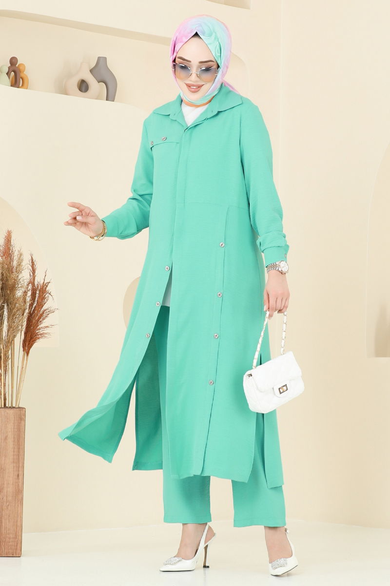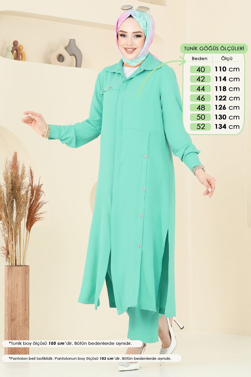 Şıklığı ve rahatlığı bir arada sunan Yandan Yırtmaçlı Aerobin Takım, su yeşili renk seçeneğiyle dört mevsim giyilebilir. Aerobin kumaşından üretilen ve 30 derecede yıkanabilen bu takım, hassaslık gerektiren temizlik koşullarına da uygun. Gizli düğme ve dekoratif yırtmaç düğmeleri ile modern bir görünüm kazandırılmış, elastik pantolon beli günlük kullanım içi konfor sağlar. Astarlı olmayan bu ürün, aktif kol düğmeleri ile fonksiyonel bir kullanım sunar.