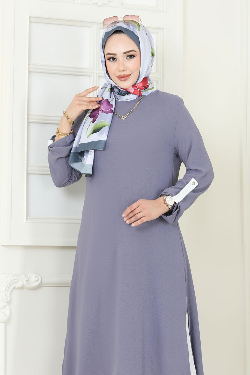Özellikler : Tesettür giyimde yeni sezon trendidir. Üstten giyme şeklindedir. Ürün bisiklet yaka tasarımına sahiptir. Tunikte yan yırtmaç bulunur. Astar içermez. Takımın pantolonu elastik belli olup, görsellikteki aksesuarlar dahil değildir. Kollarındaki manşet düğmeler aktif olarak kullanılabilir. Çekimlerin ışıklandırma efektlerine bağlı olarak renk tonlarında değişiklik olabilir.