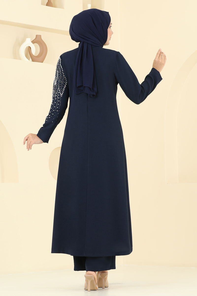 Ürün Detayları: Modaya uygun yeni sezon tesettür kıyafetidir. Yarım Hakim yaka detayına sahiptir. Sırt kısmı fermuarlıdır. İnciler dikilmiş, taşlar ise yapıştırılmıştır. Pantolonun beli elastiktir.Renk tonlarında çekimlerden dolayı farklılıklar olabilir.
