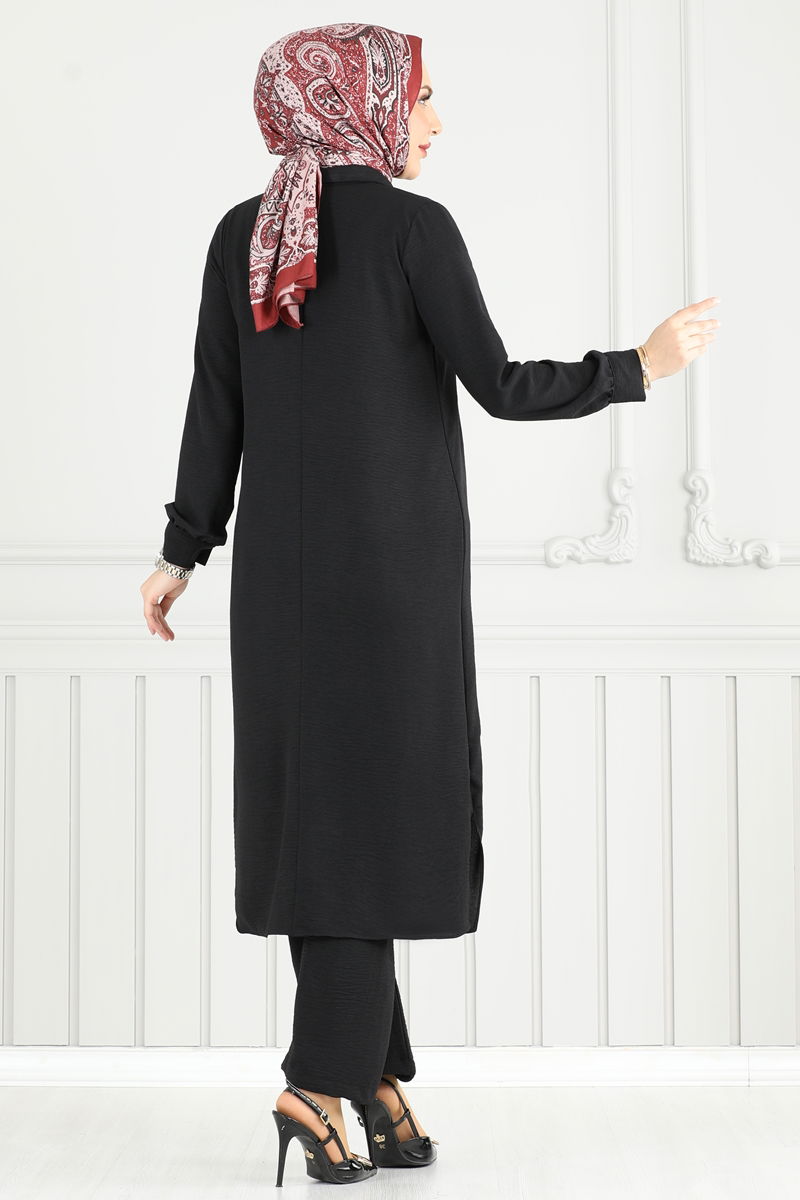 Eşarp Kodu Üzerindeki Ürün: 204MDI1081Eğer mütevazı ve şık bir görünüm arıyorsanız, bu Siyah Yarım Düğmeli Aerobin Takım ideal seçim. Dört mevsim boyunca rahatlıkla giyebileceğiniz bu set, 30 derecede yıkama olanağı ile kolayca temizlenebilir. Gömlek yaka tasarım ve yarım düğmeli olan tunik, yan tarafında zarif yırtmaçları ile modern bir görünüm sunar. Elastik beli sayesinde tüm gün konforlu bir kullanım sunan pantolon, tunikle mükemmel uyumunu tamamlayarak sizlere şık bir kombin sunar. Bu parça, hem günlük kullanımınız için hem de daha özel anlar için idealdir ve gardırobunuzda öne çıkan bir yere sahip olacaktır.