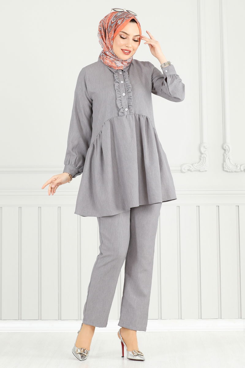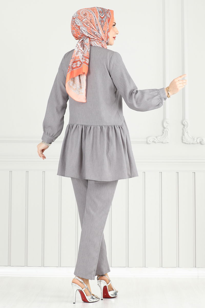 Yarım Düğmeli Tesettür Takım 6093TEG847-MS Gri