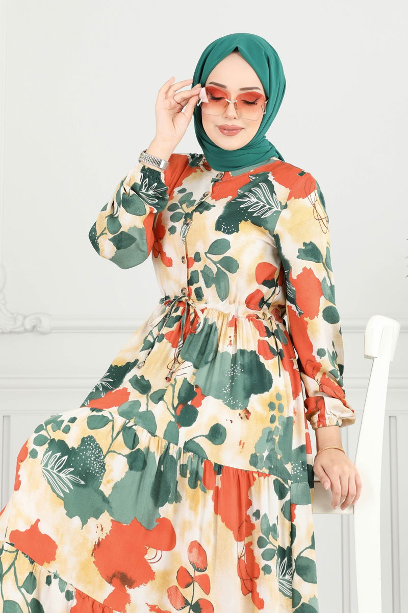 Yarım Düğmeli Viskon Elbise 7124ERK1158-MS Zümrüt