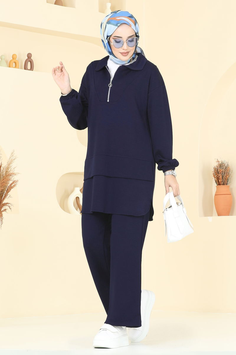Ürün Açıklaması : Tesettür giyimde yeni sezon ürünüdür. Üründe ön kısımda kullanıma uygun fermuar mevcuttur. Gömlek tipi yakaya sahiptir. Tunik yanlarda yırtmaç detaylarına sahiptir ve astarsızdır, pantolonun beli esnektir ve lastiklidir. Ürün manşetleri de lastikli yapıdadır. Fotoğraf çekimlerinden kaynaklı renk farklılıkları olabilir.