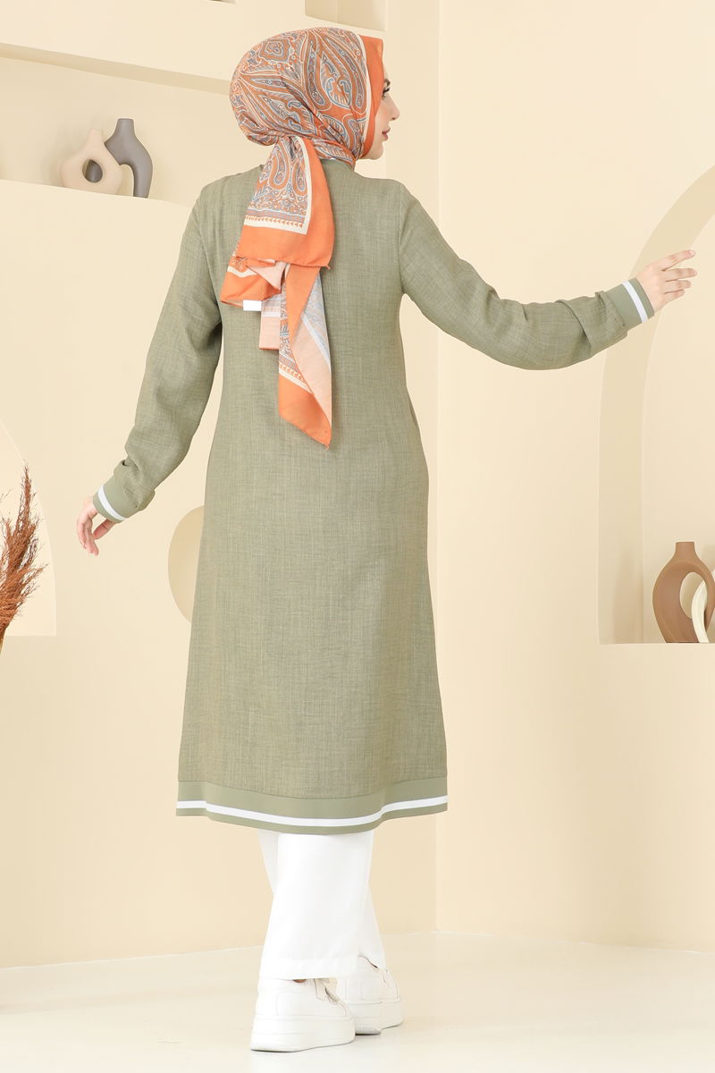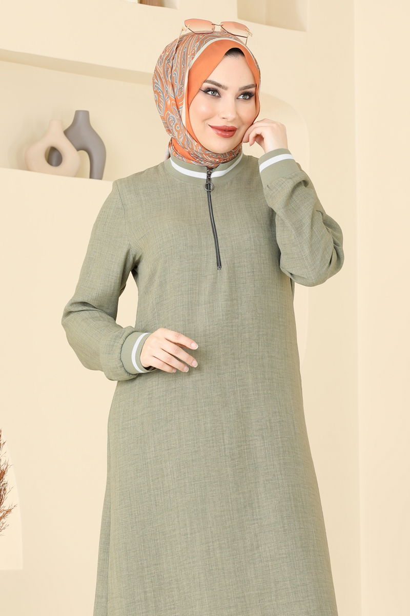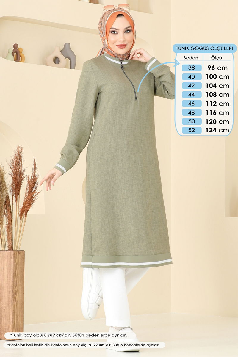 Ürün Nitelikleri :Moda öncüsü tesettür giyim modelidir. Pratik kullanım için fermuar detayı mevcuttur. Üründeki yaka tipi Bisiklet yakadır ve astarsızdır. Pantolonun bel kısmında esneklik sağlayan lastik kullanılmıştır. Çekim tekniklerinden dolayı renkte değişiklikler olabilir.