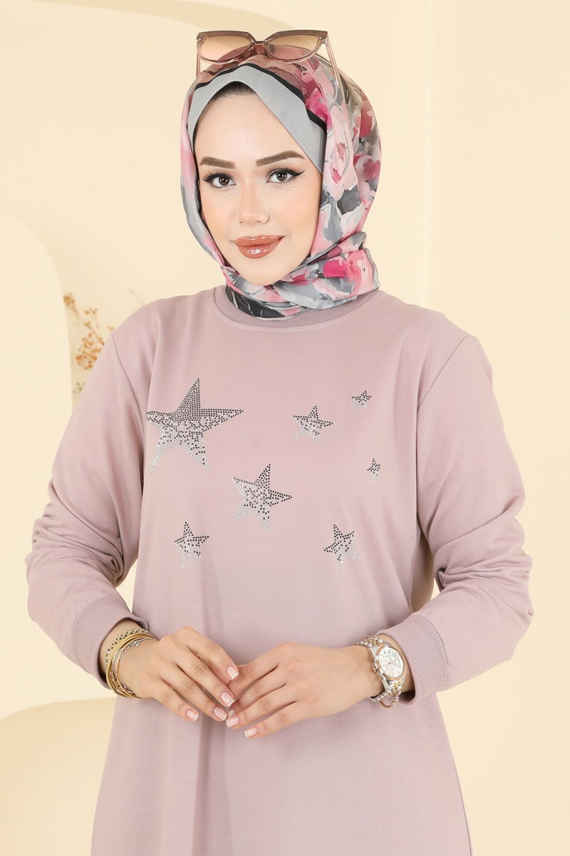 Yıldız Motifli İkili İpli Elbise, pudra tonunda ve tesettür moda anlayışına uygun şık bir tasarıma sahiptir. Her mevsim giyilebilir olan bu elbise, iki ipli kumaşından dolayı çok uygun ve konforlu bir kullanım sağlar. Taş detaylar ise, yıkama ve ütüleme sırasında özen gösterilmesi gereken bir unsurdur. Günümüz modası olan bisiklet yaka ile modern bir izlenim verir ve astarsız yapısı sayesinde hafif ve rahat bir seçenektir. Üzerindeki ürün M boyuttadır.ELBİSE BOYUT ÖLÇÜLERİ (CM)Beden Göğüs Boy M 108 128 L 112 128 XL 116 128 XXL 120 128 Ağırlık(Kg):0.39 -