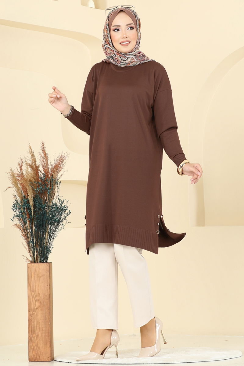 Yırtmaç Düğmeli Merserize Tunik 5006KLN570-MS Kahve