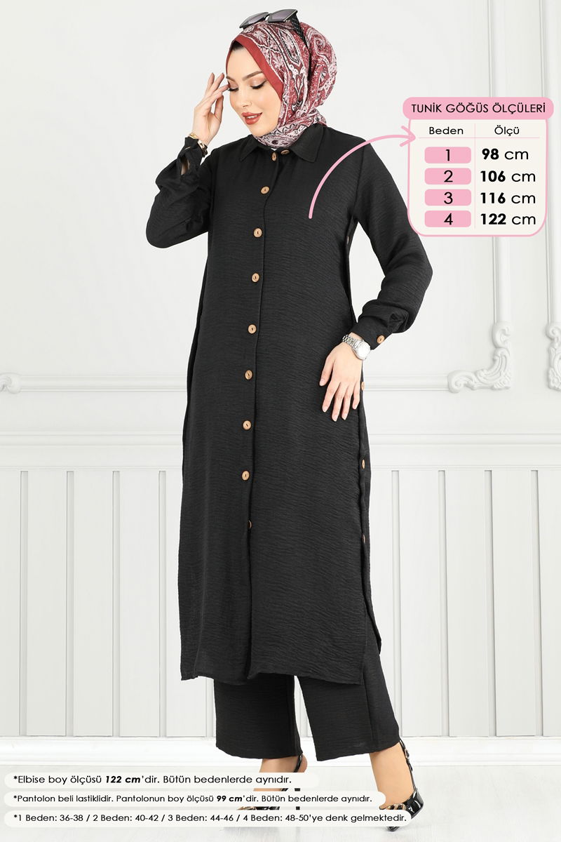 Tasarım Detayları: Yeni sezon tesettür koleksiyonundandır. Gömlek yaka tasarıma sahiptir. Önden düğmelidir. Yırtmaç düğmeleri dekoratif amaçlıdır. Astarsızdır. Bluz ürüne dahil değildir; kullanım amacını göstermek için kombin yapılmıştır. Pantolon beli lastiklidir. Manşet düğmeleri aktiftir. Konsept çekimlerden dolayı renk tonlarında farklılık olabilir.