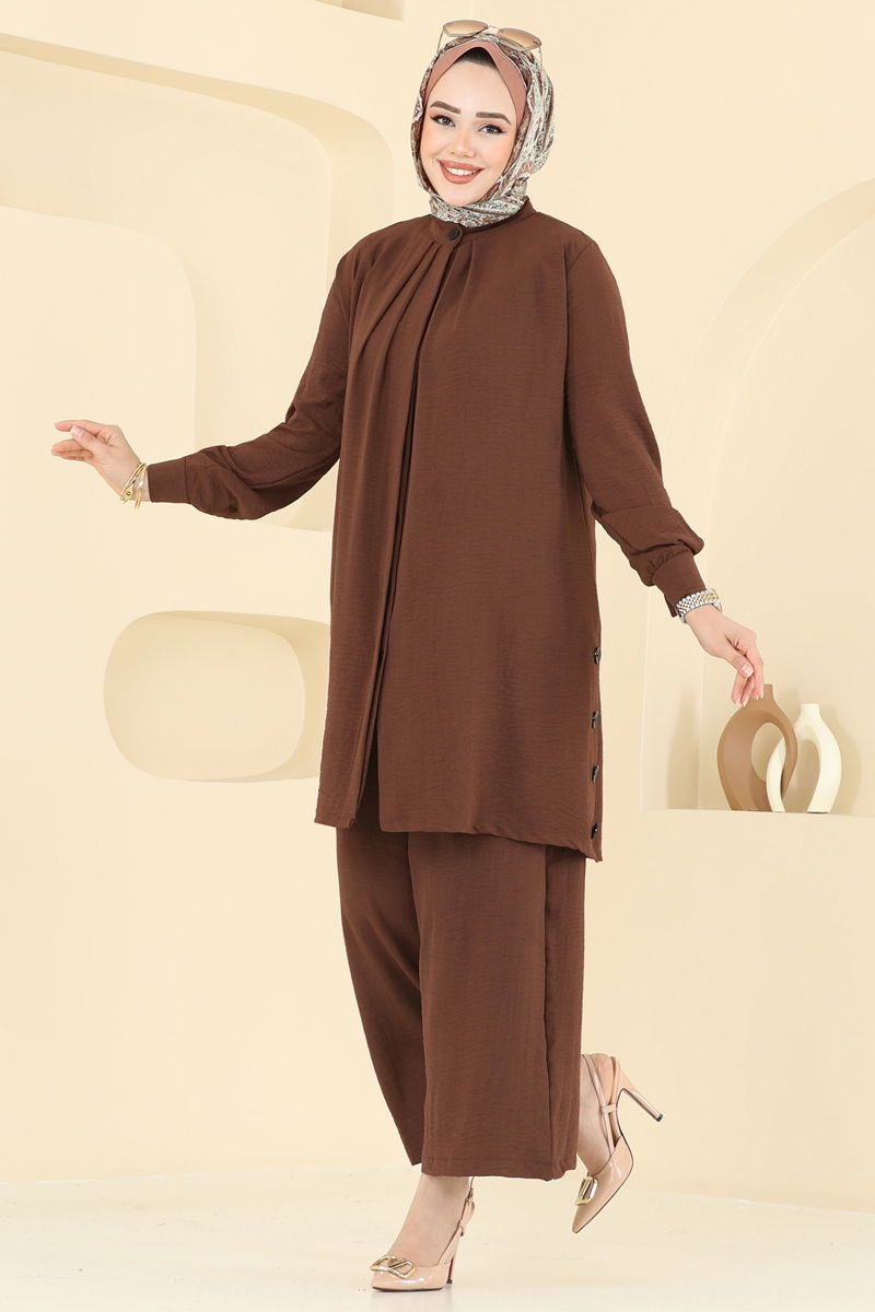 Yırtmaç Düğmeli Tesettür Takım 3100HBS856-MS Kahve
