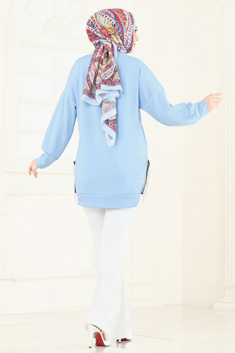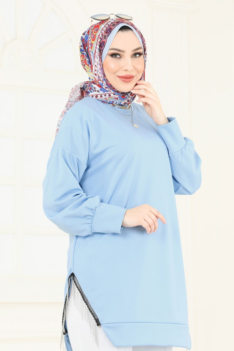 Ürün Nitelikleri : Tesettür modasına uygun yeni sezon ürünüdür. Ürünün yaka tipi Bisiklet yakadır. Tunik yanlarda yırtmaç detaylarına sahiptir. Astarı bulunmamaktadır. Zincir detayları dikilmiştir. Ürün aksesuarları dahil değildir. Pantolonun bel kısmı lastiklidir ve ispanyol paça tasarımına sahiptir. Fotoğraf çekimlerinden ötürü renk farklılıkları olabilir.